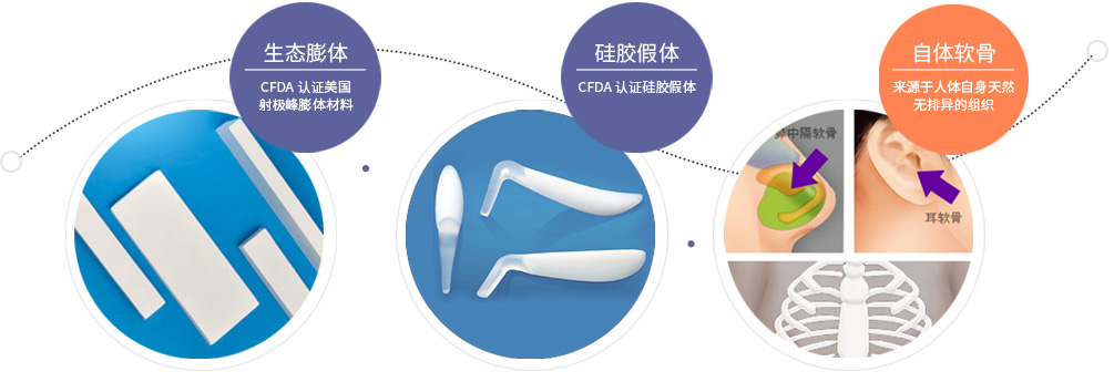 手術(shù)材料:假體+自體組織材料(自體耳軟骨,鼻中隔軟骨,自體肋軟骨)