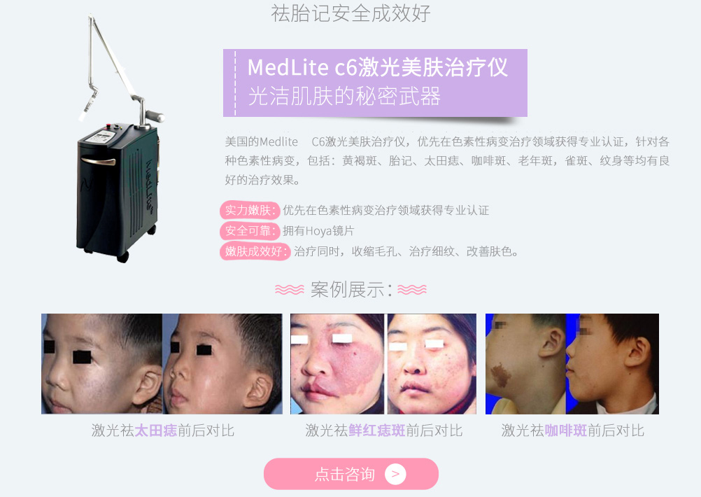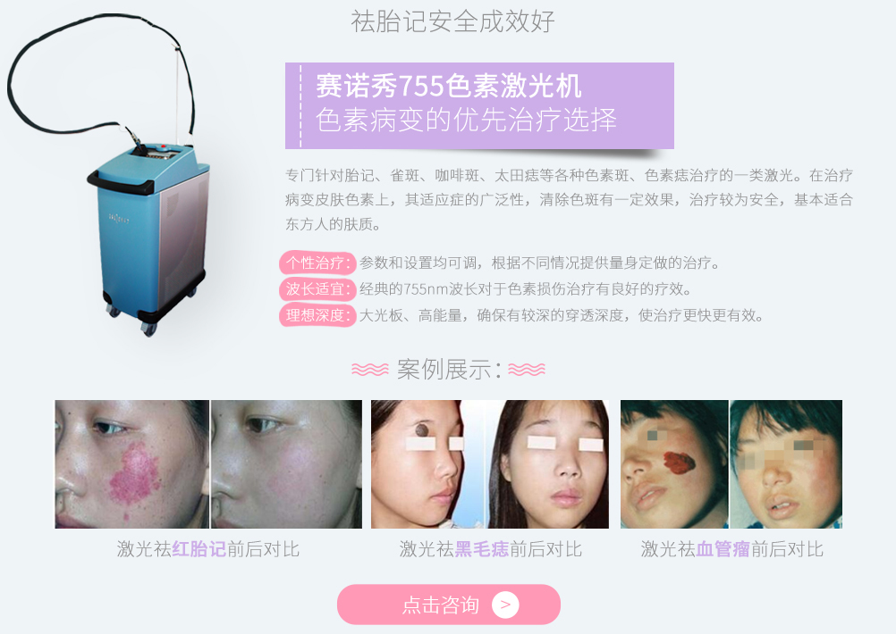采用溶解術(shù),作用于異常病變的胎記血管瘤皮膚組織,使病損區(qū)血管的血紅蛋白凝固或血管壁破壞,封閉異常血管,實(shí)力溶解病變色素細(xì)胞和血管。