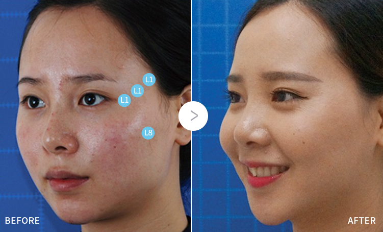 將喬雅登注射于L1點位,提升外側(cè)頰部和眼角;注射于L8點位,提升面頰部和鼻唇溝,可使凹陷部位變得充盈。