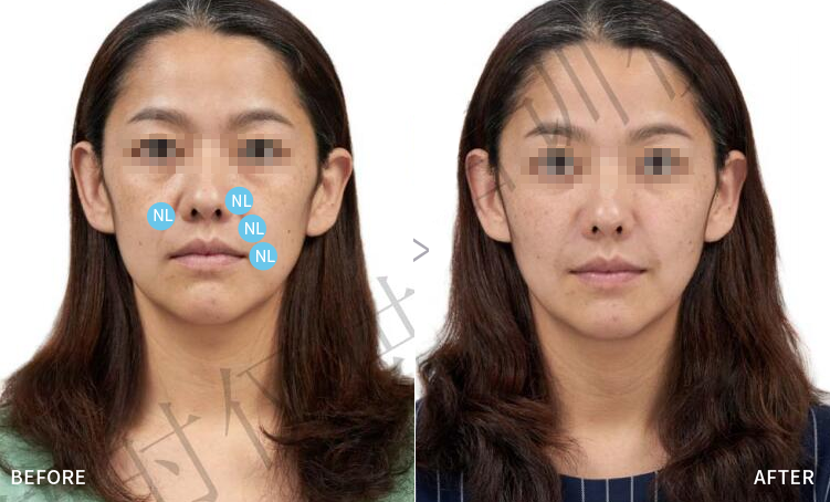 將喬雅登注射于NL點位,支撐鼻唇溝的深層結(jié)構(gòu),較好的改善鼻唇溝的皺褶狀態(tài)。