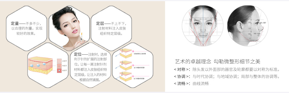 微整形是利用無創(chuàng)技術(shù)對(duì)美麗極致的演繹,人的皮膚有著不同的結(jié)構(gòu)和層次,其中分布有不同的血管和神經(jīng)組織,只有將注射材料精準(zhǔn)無誤的注入特定的層次和部位,才能呈現(xiàn)出完美的效果,因此對(duì)注射位置、注射層次、注射計(jì)量的嚴(yán)格把控尤為重要。而“精確分層注射法”就能夠做到這一點(diǎn),并能夠安全精準(zhǔn)的塑造出自然生動(dòng)的面部輪廓,讓你美的自然。